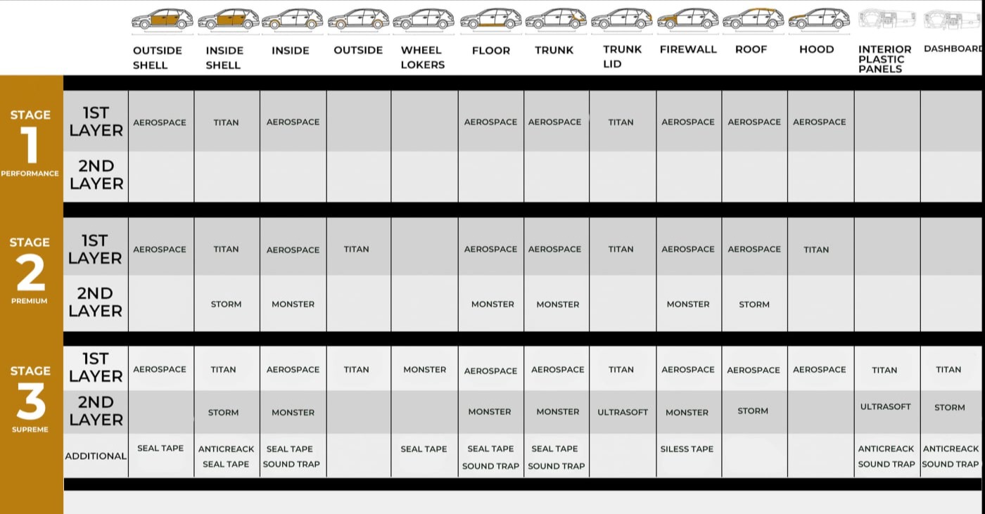 Supreme - Maximum noise isolation, including the dashboard and plastic panels.